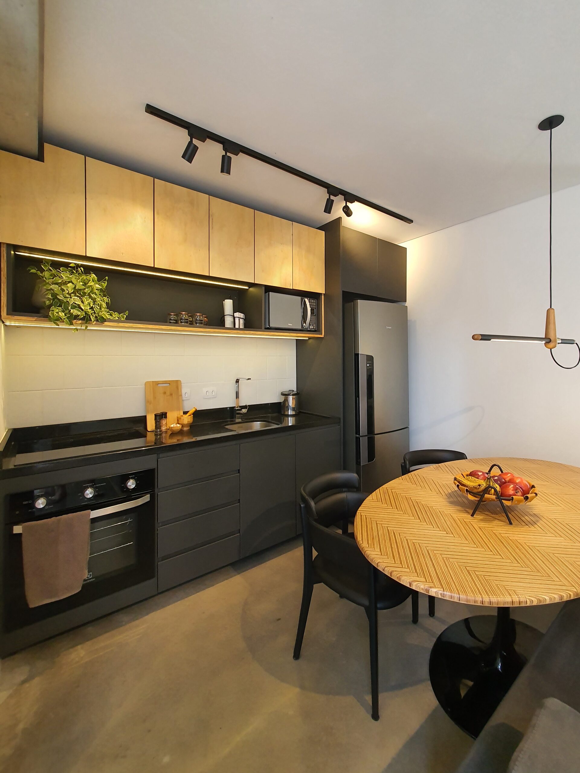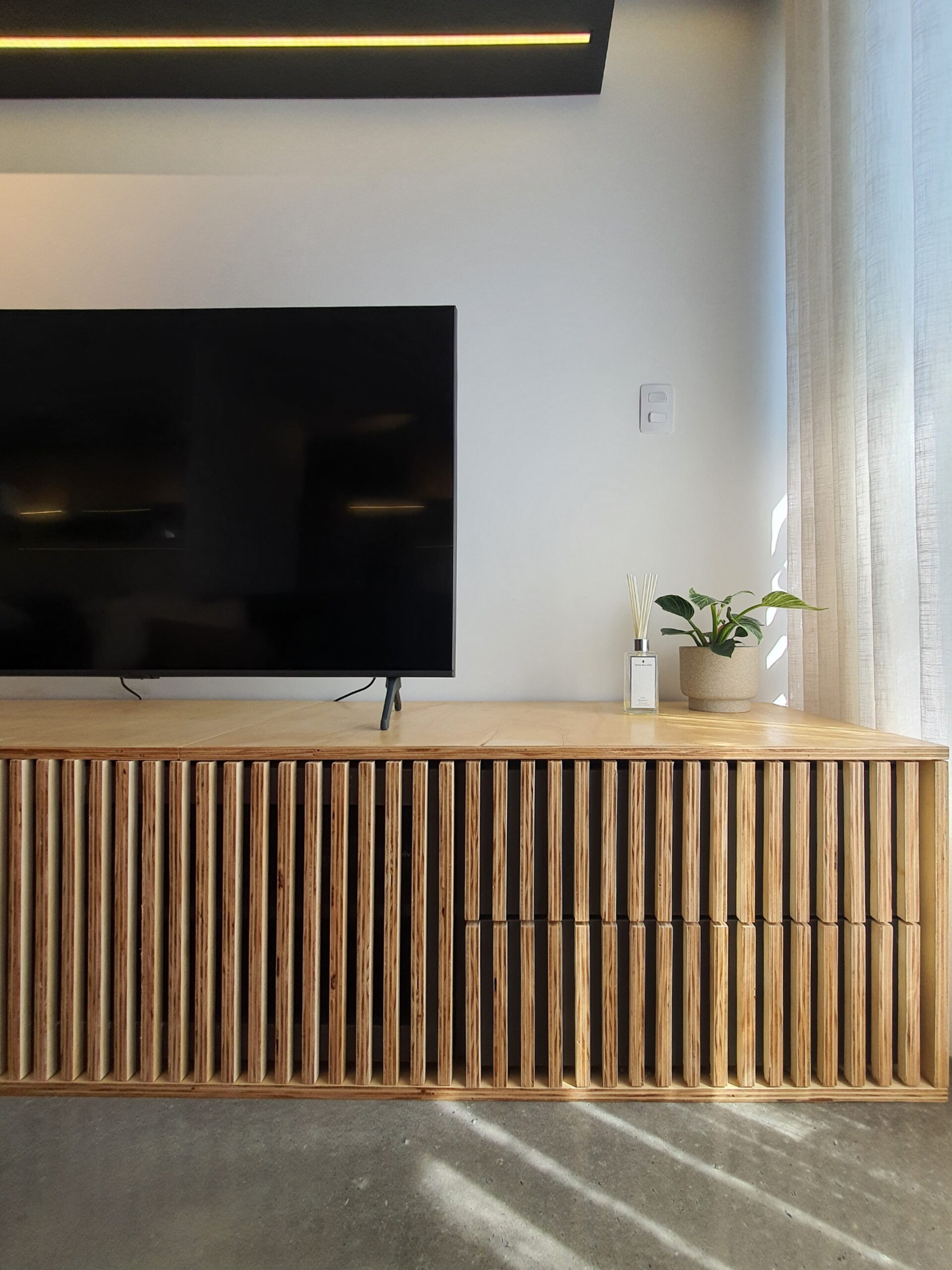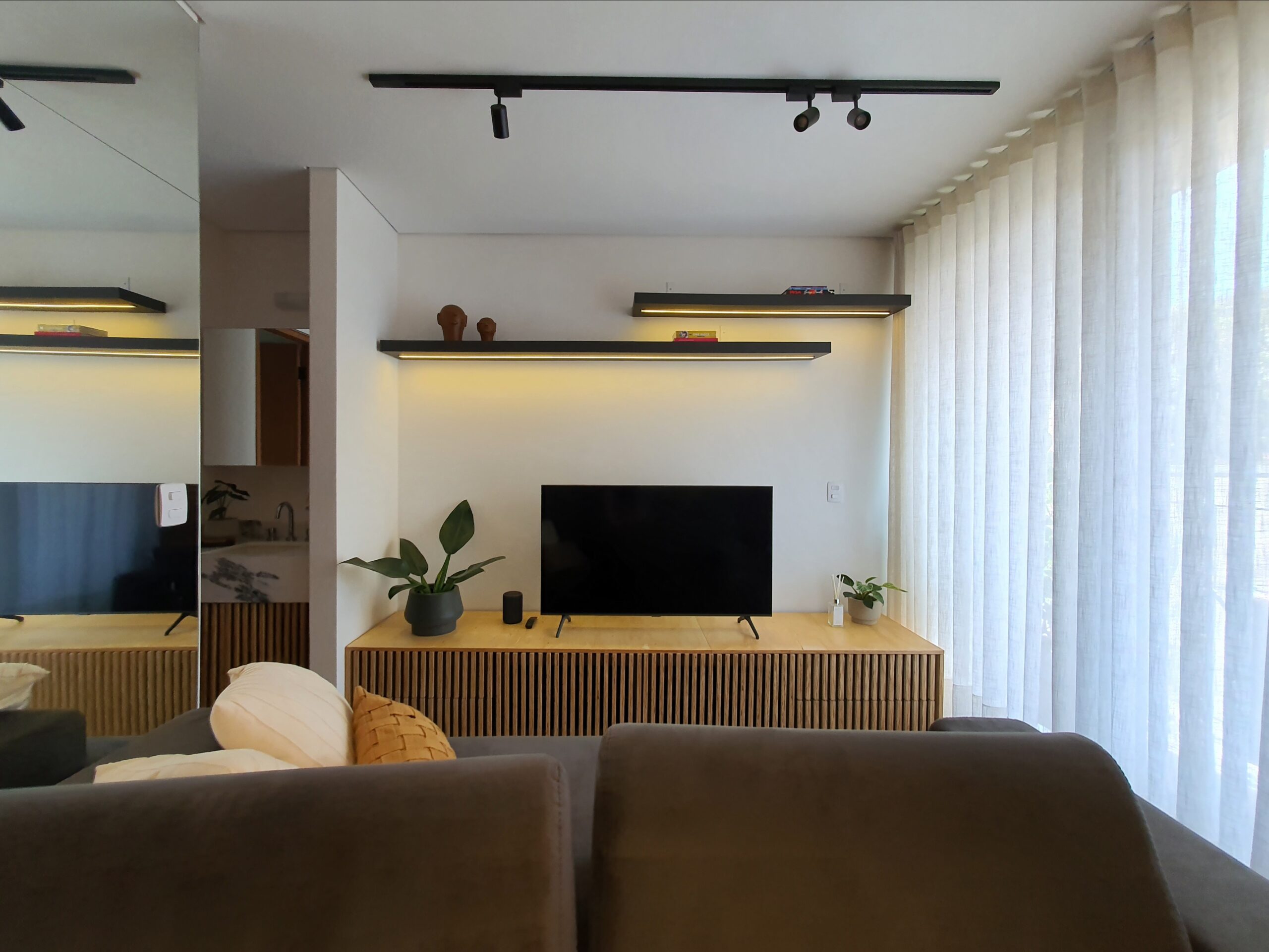 Soluções personalizadas refletem as necessidades do cliente, como o extenso cabideiro de roupas, automações para cortinas e os armários ripados, que trazem ventilação e camuflam equipamentos. A escolha de acabamentos foi essencial para criar uma linguagem visual única: madeira clara e marcenaria em cinza escuro adicionam equilíbrio e peso visual, enquanto a estética limpa e organizada expressa perfeitamente a personalidade do morador. O Apartamento OF é a prova de que viver bem não depende de grandes dimensões, mas de um projeto pensado nos mínimos detalhes para oferecer praticidade, beleza e identidade.