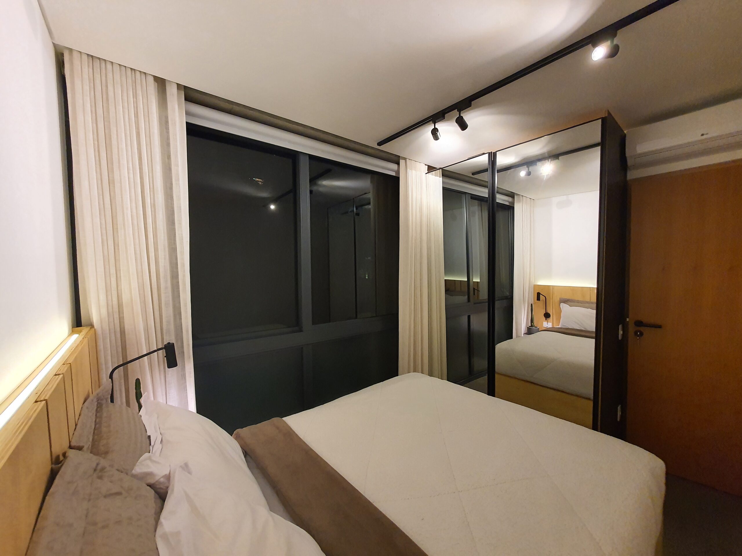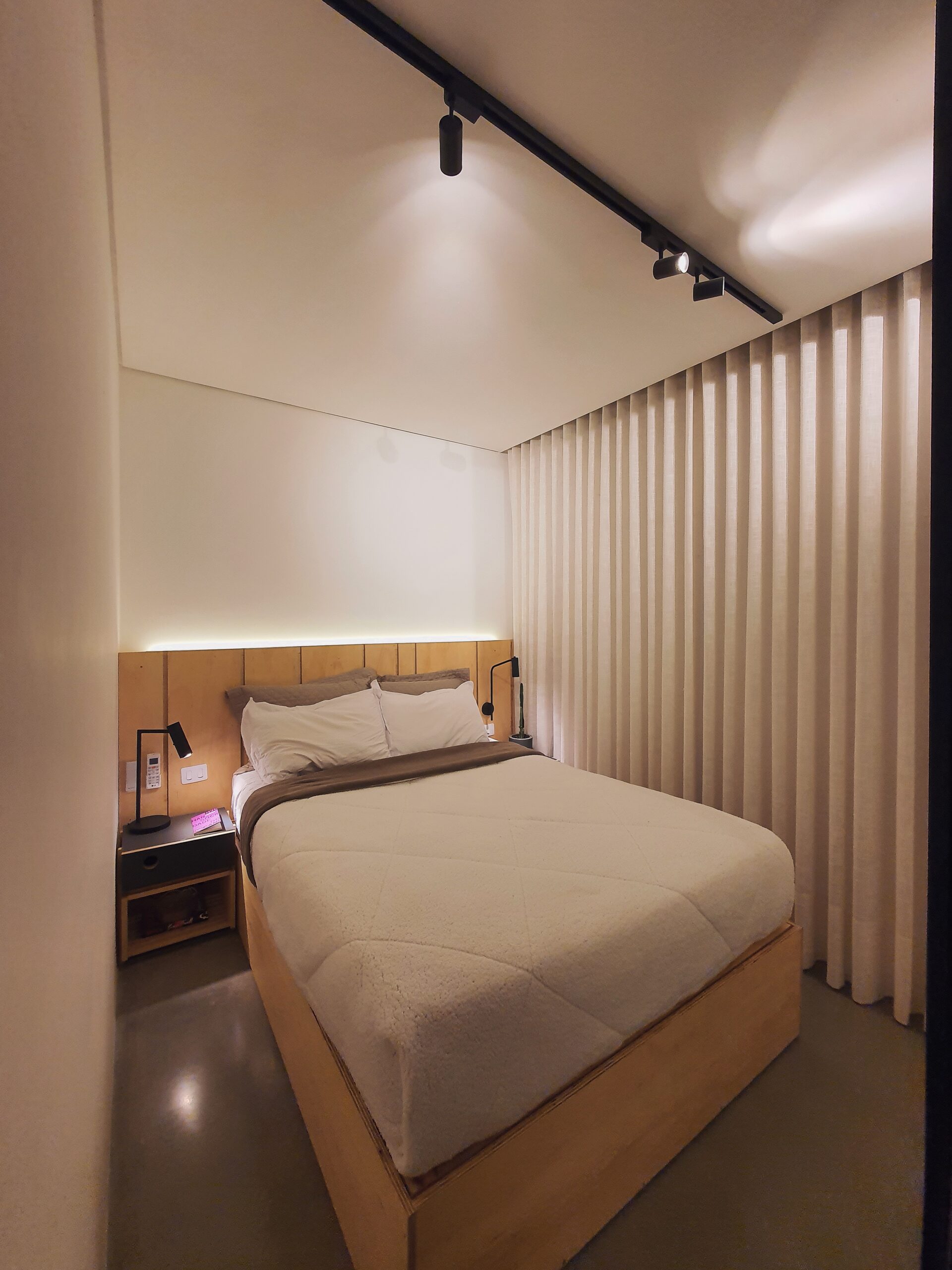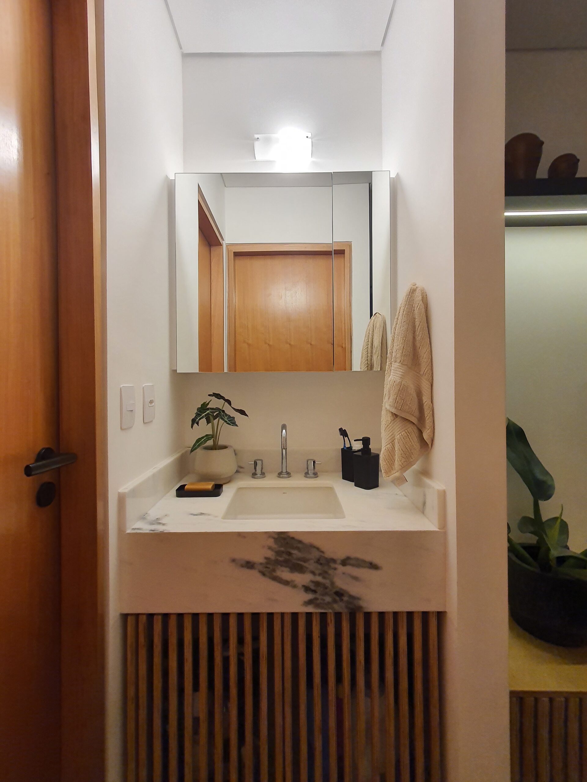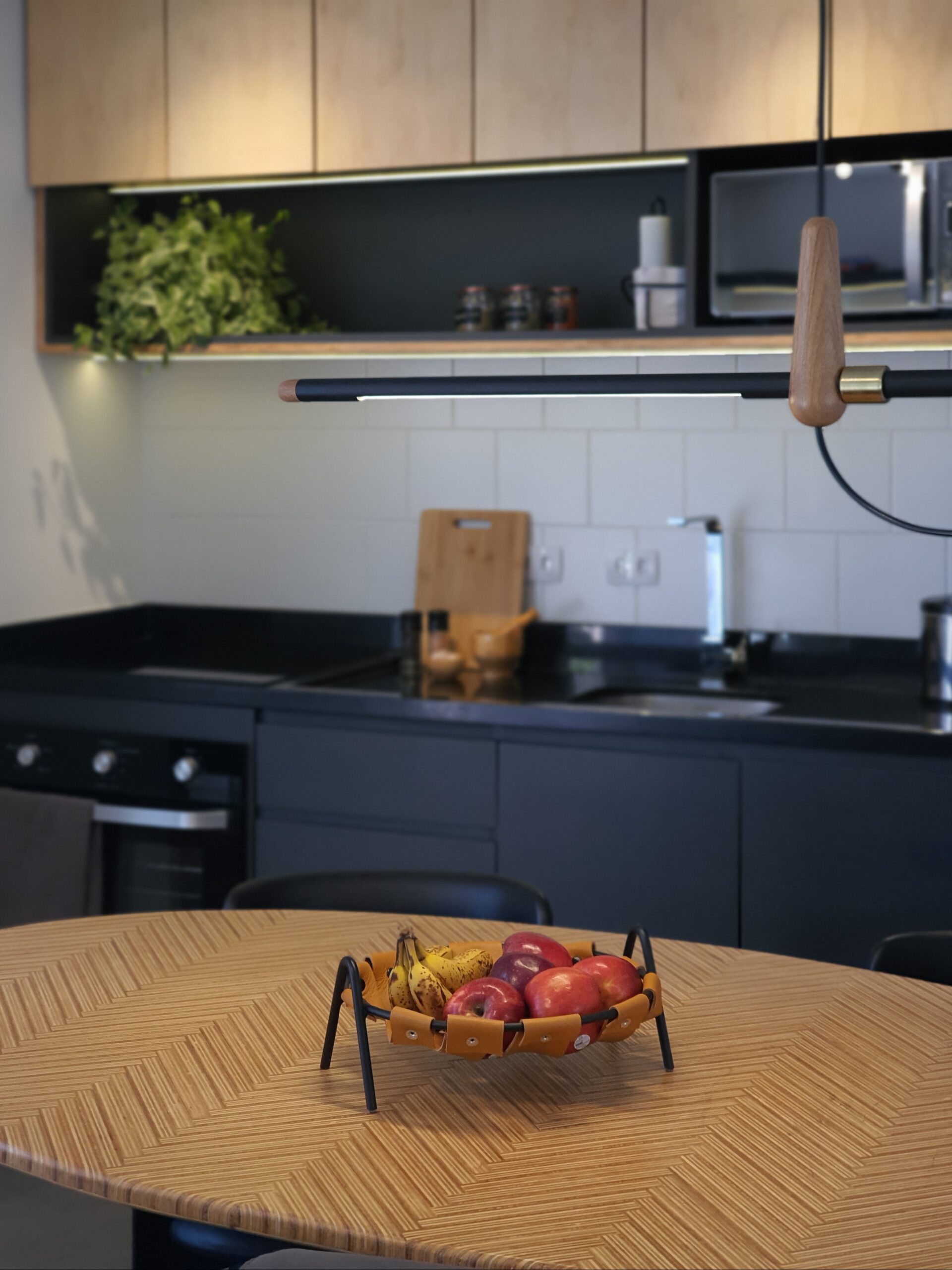 Soluções personalizadas refletem as necessidades do cliente, como o extenso cabideiro de roupas, automações para cortinas e os armários ripados, que trazem ventilação e camuflam equipamentos. A escolha de acabamentos foi essencial para criar uma linguagem visual única: madeira clara e marcenaria em cinza escuro adicionam equilíbrio e peso visual, enquanto a estética limpa e organizada expressa perfeitamente a personalidade do morador. O Apartamento OF é a prova de que viver bem não depende de grandes dimensões, mas de um projeto pensado nos mínimos detalhes para oferecer praticidade, beleza e identidade.