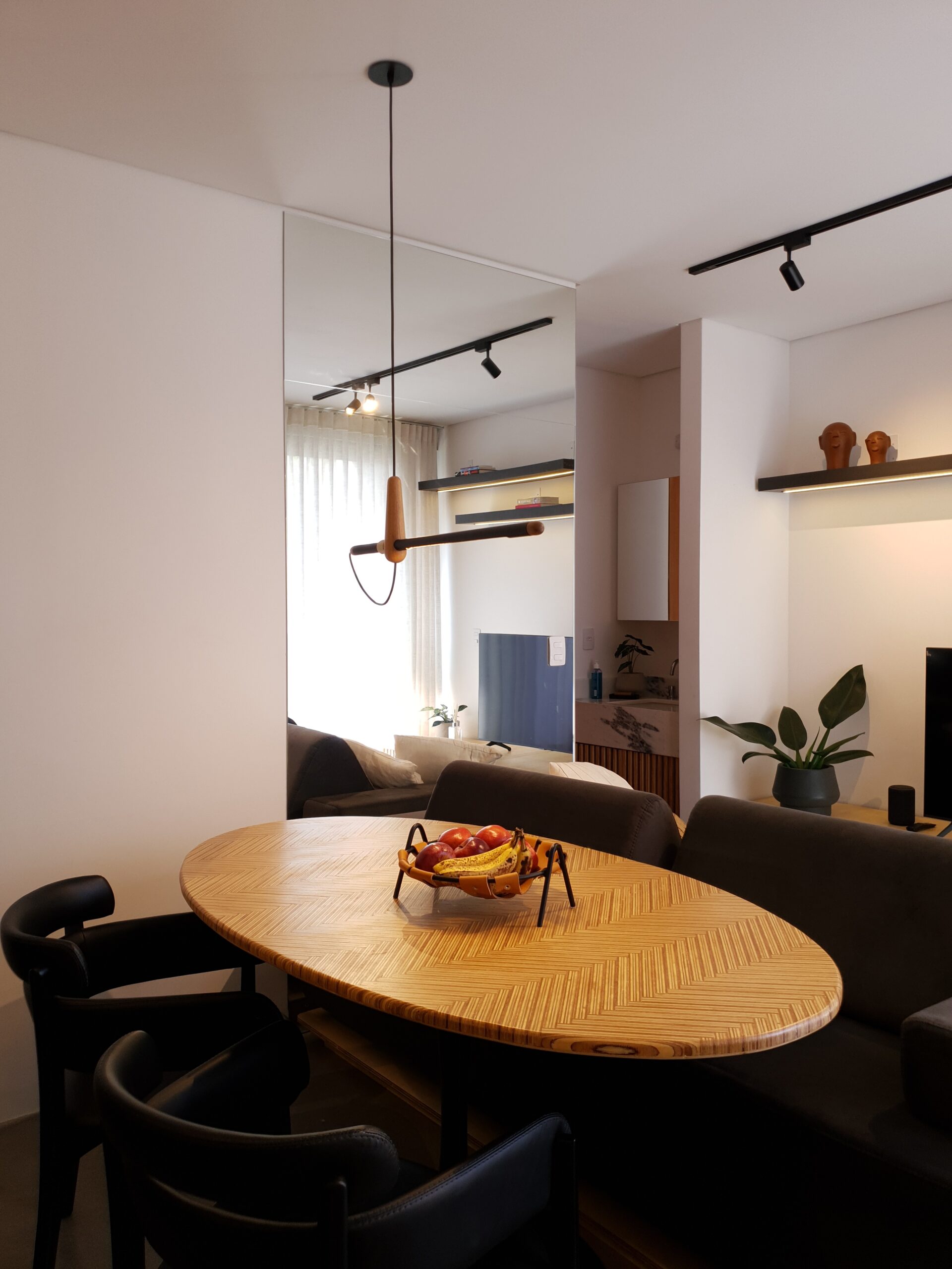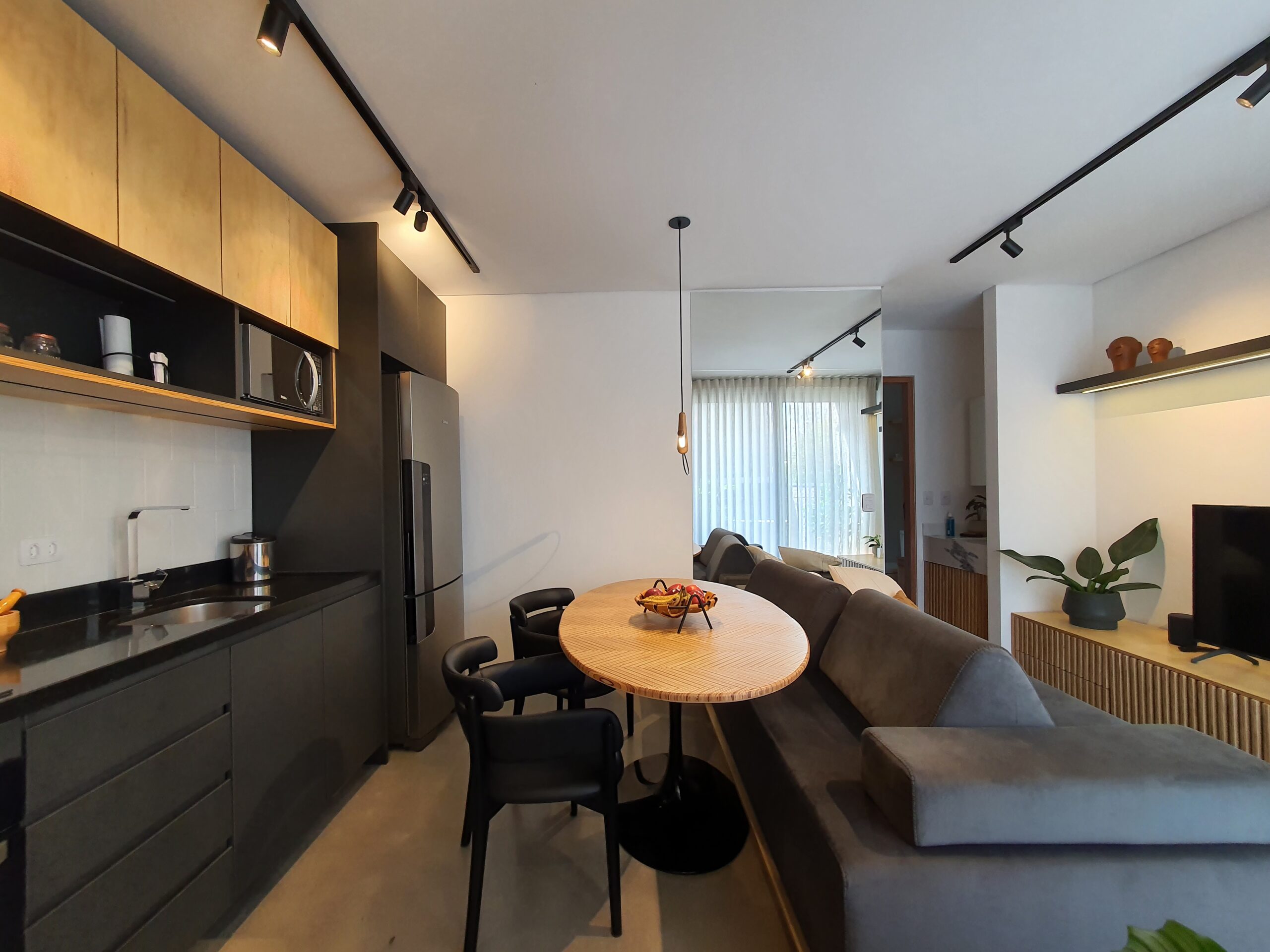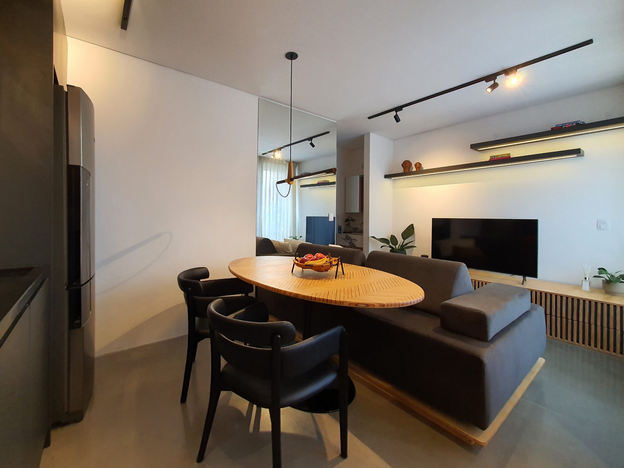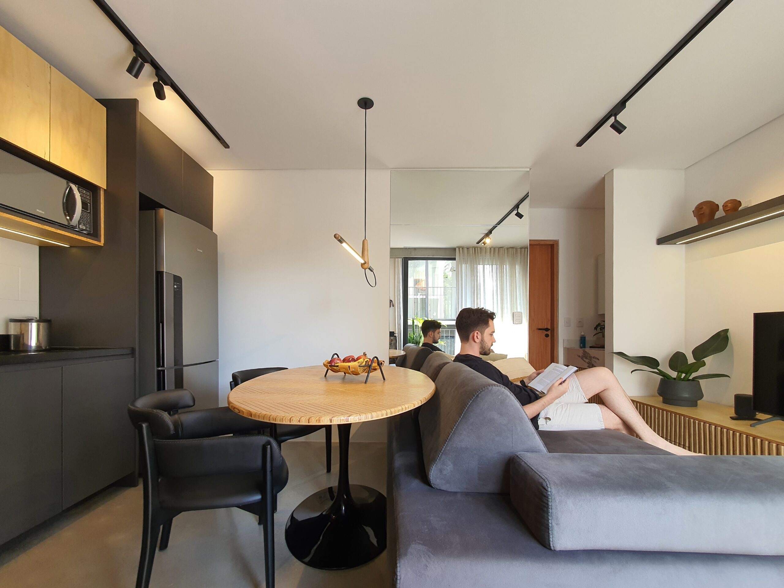 Localizado em São Paulo, este estúdio de 35,3m² foi projetado para traduzir a individualidade do cliente e otimizar cada centímetro do espaço. O layout foi cuidadosamente planejado para oferecer funcionalidade, conforto e sofisticação em um ambiente compacto, ideal para uma pessoa. Destaque do projeto, o mobiliário versátil garante múltiplas funções em cada peça. A sapateira no hall de entrada não apenas organiza, mas também dá as boas-vindas de forma prática e estilosa. Na sala, o sofá-ilha é um elemento-chave: acomoda mais pessoas na mesa de jantar, transforma-se em cama para visitas e mantém o conforto de uma sala de TV. A cama baú oferece amplo armazenamento sem sacrificar o estilo.