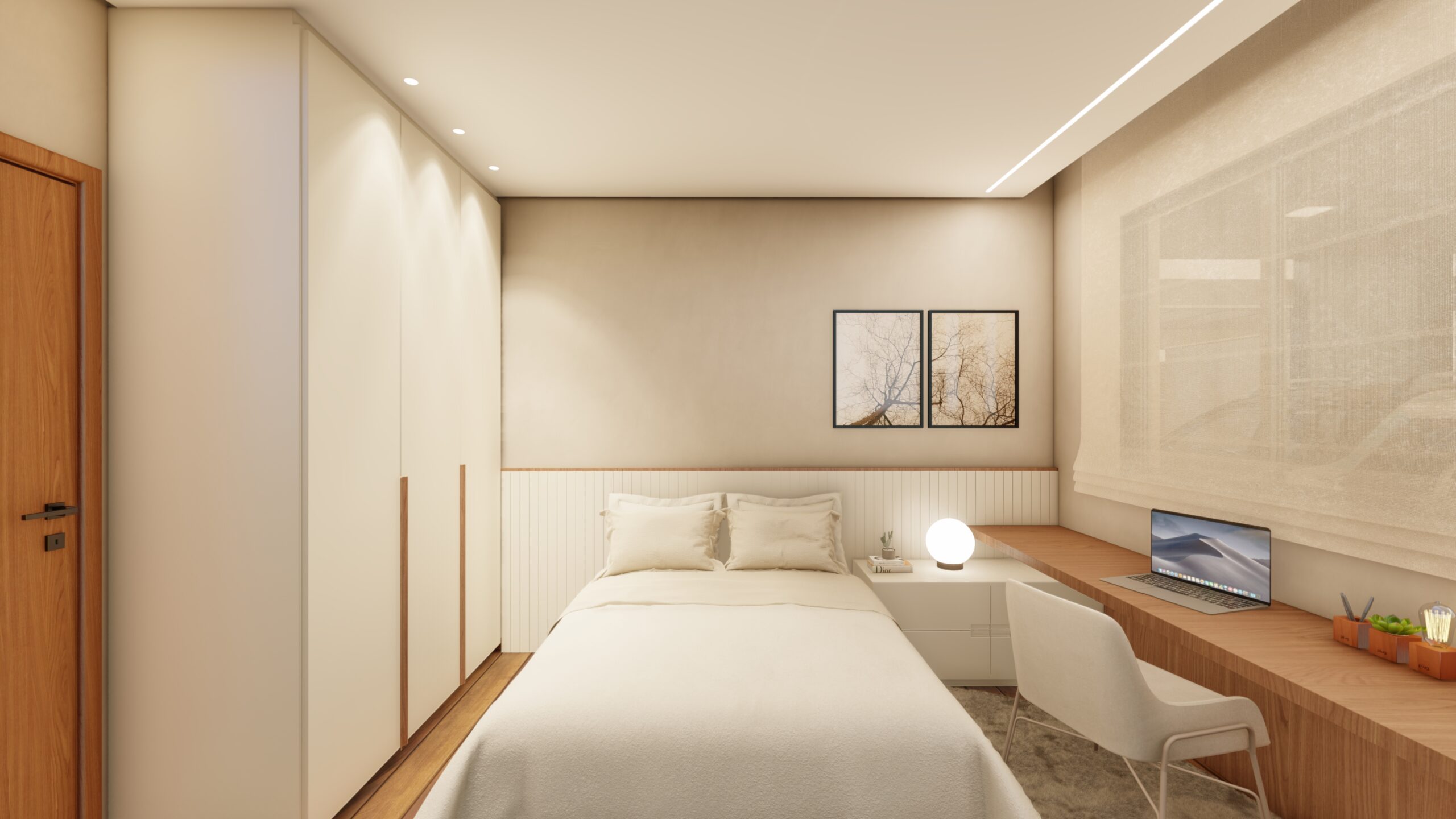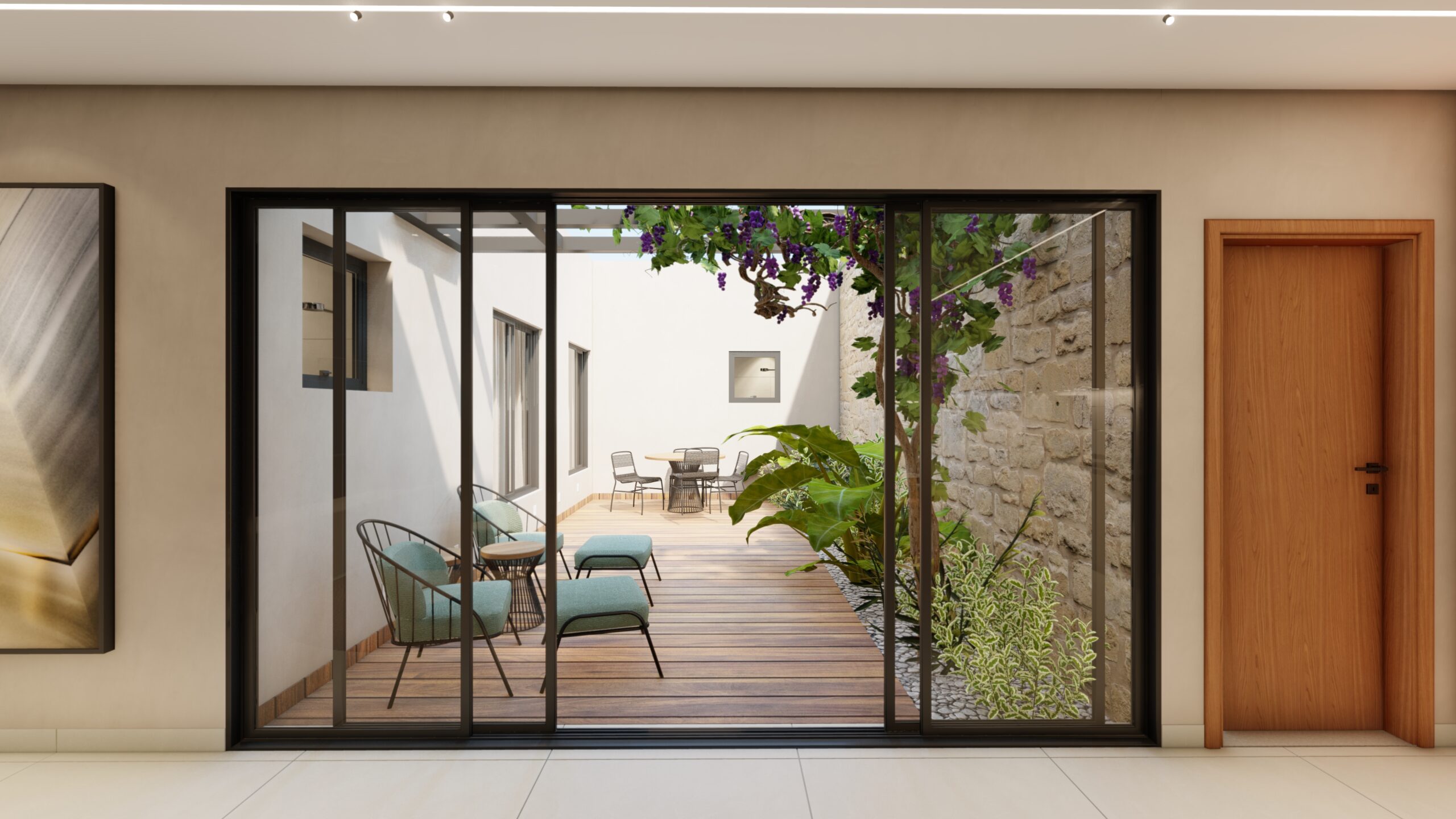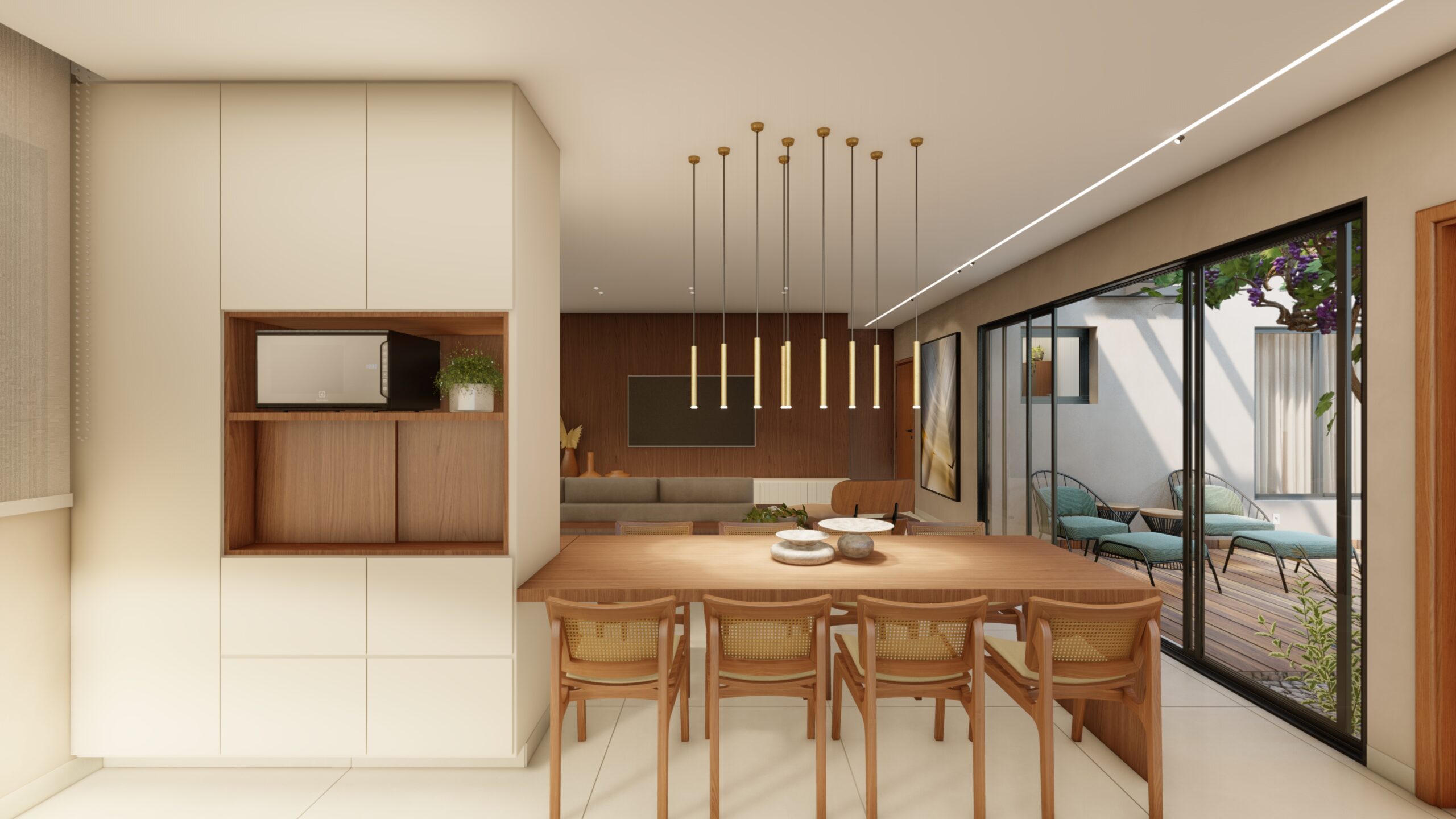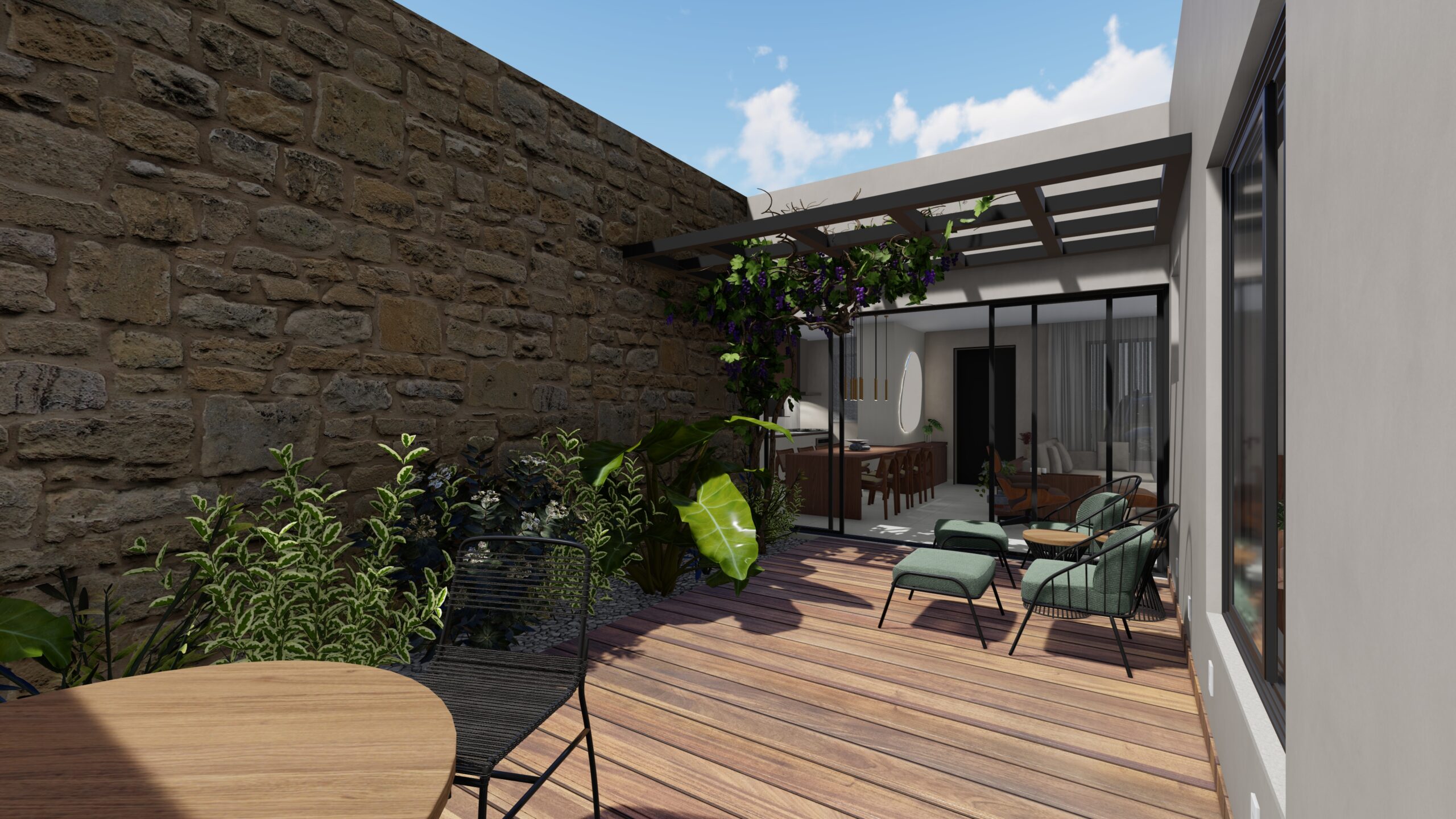 Em um lote compacto de 225m², projetamos uma casa térrea que une funcionalidade, conforto e harmonia com a natureza. O coração do projeto é um pátio central, pensado como um espaço de relaxamento e convivência. Esse ambiente a céu aberto foi idealizado para banhos de sol e o cultivo de videiras, cujos frutos e flores se integram ao cotidiano da casa. Com poltronas aconchegantes e uma mesa para refeições ao ar livre, o pátio transforma-se em um refúgio dentro da própria residência. A casa conta com uma ampla suíte para o casal e dois quartos de visitas, prontos para receber as filhas que moram fora. Já os espaços comuns de cozinha, sala de TV e jantar foram projetados de forma integrada, proporcionando amplitude e interação em todos os momentos.