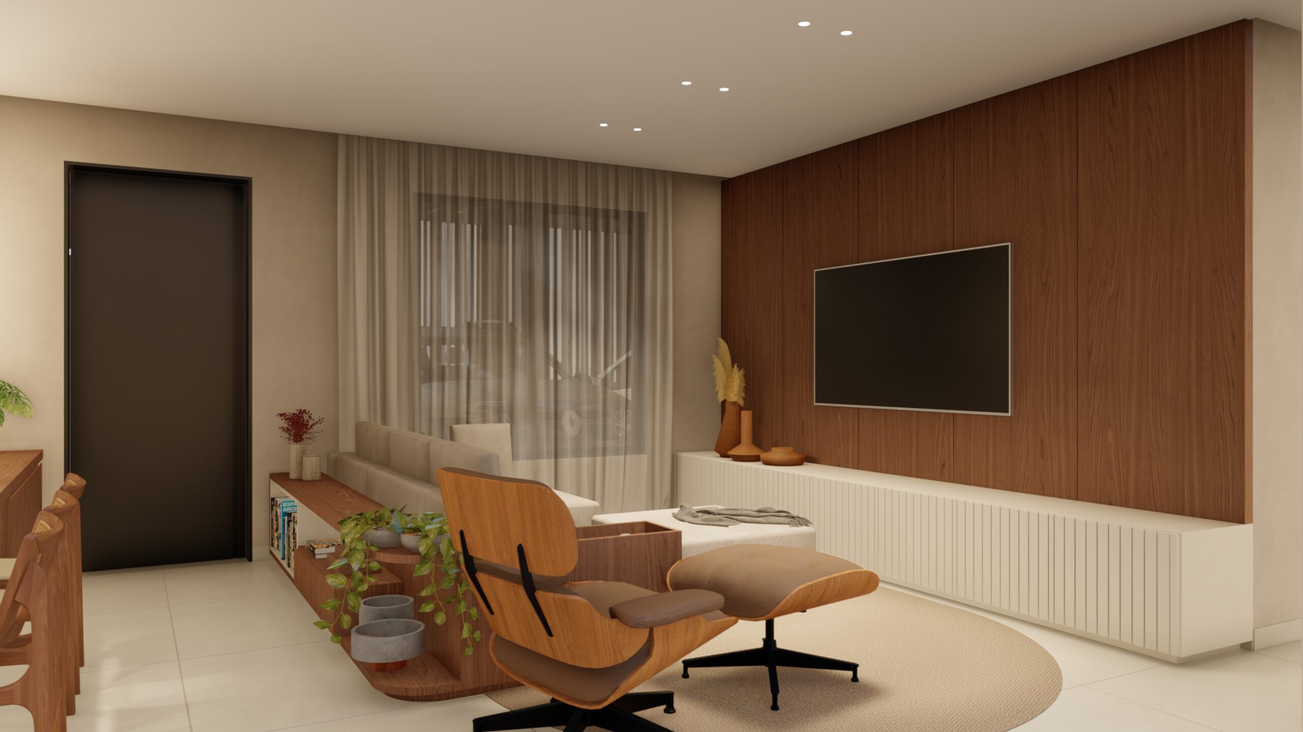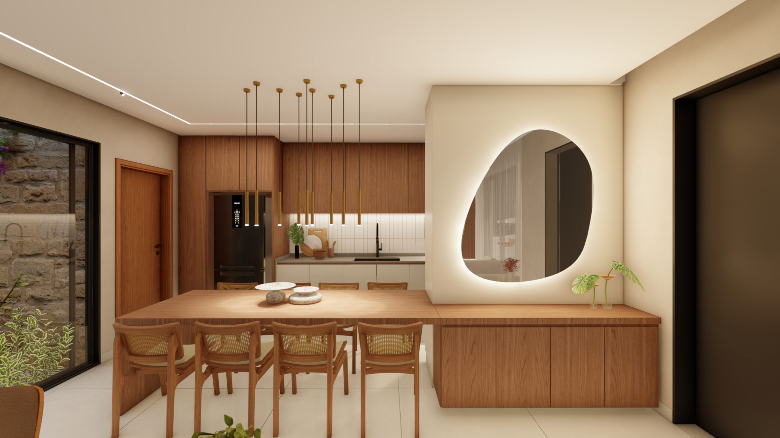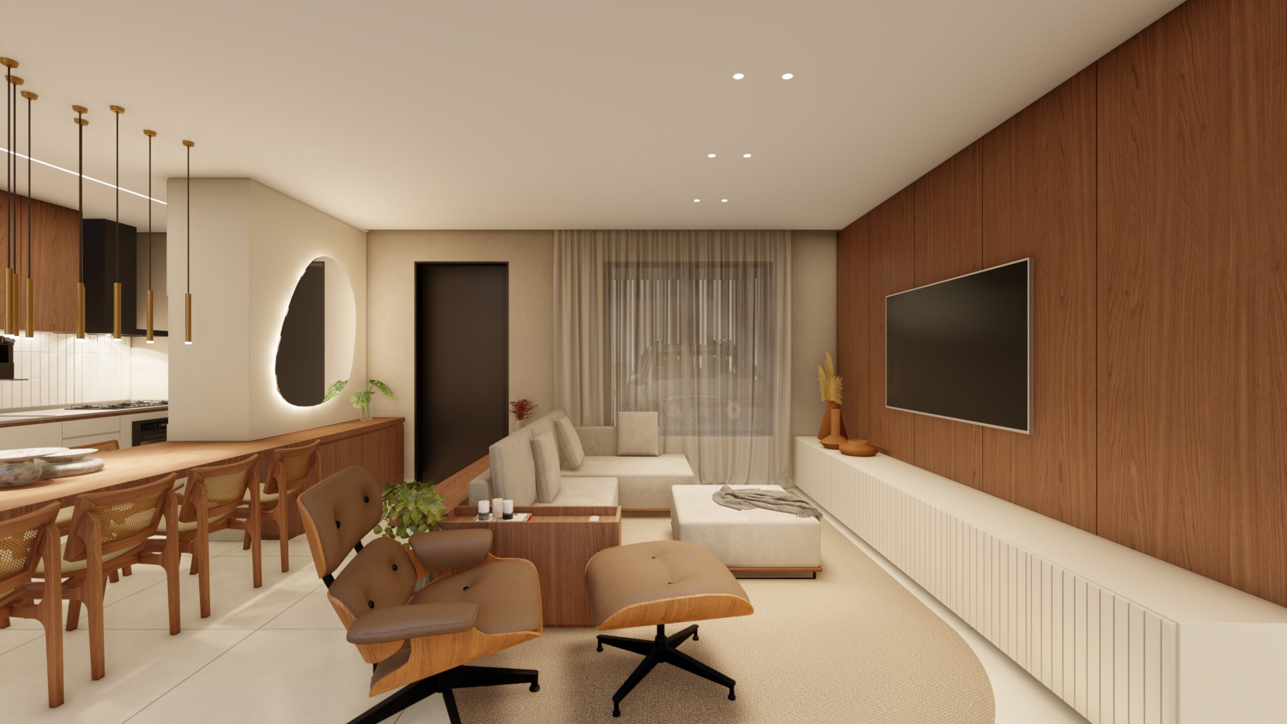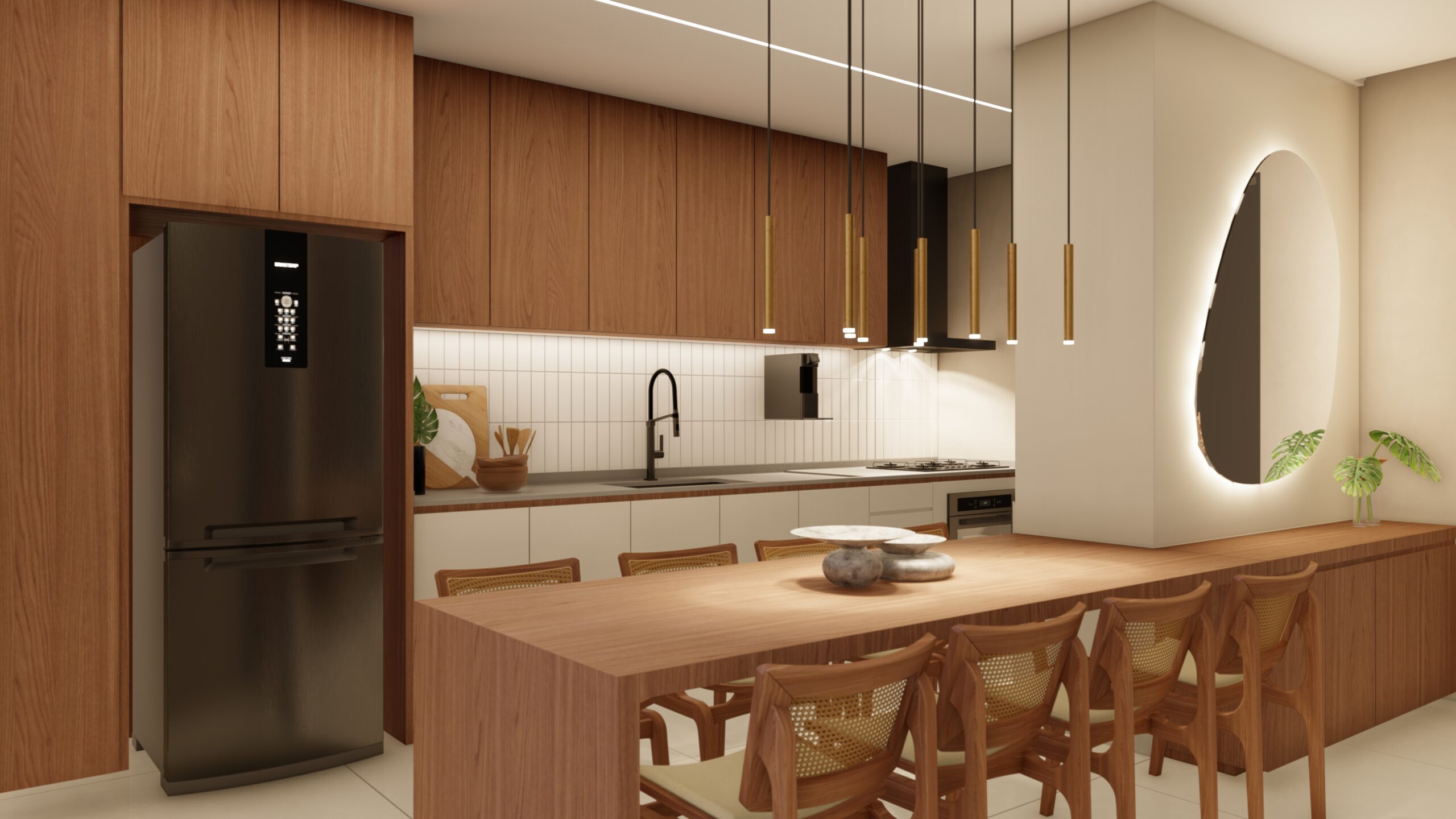 A fachada moderna e privada acomoda vagas para três carros e inclui uma entrada exclusiva para pedestres, garantindo funcionalidade e praticidade ao dia a dia. Um lar onde cada espaço é pensado para acolher, reunir e celebrar a vida em família.